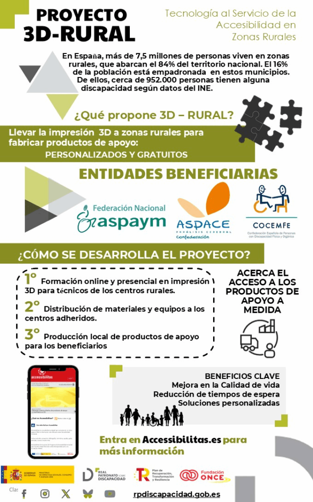 La Federación Nacional ASPAYM participa activamente en el Proyecto 3D-Rural. Esta innovadora iniciativa busca llevar la tecnología de impresión 3D a las zonas rurales de España para fabricar productos de apoyo personalizados y gratuitos destinados a personas con discapacidad.