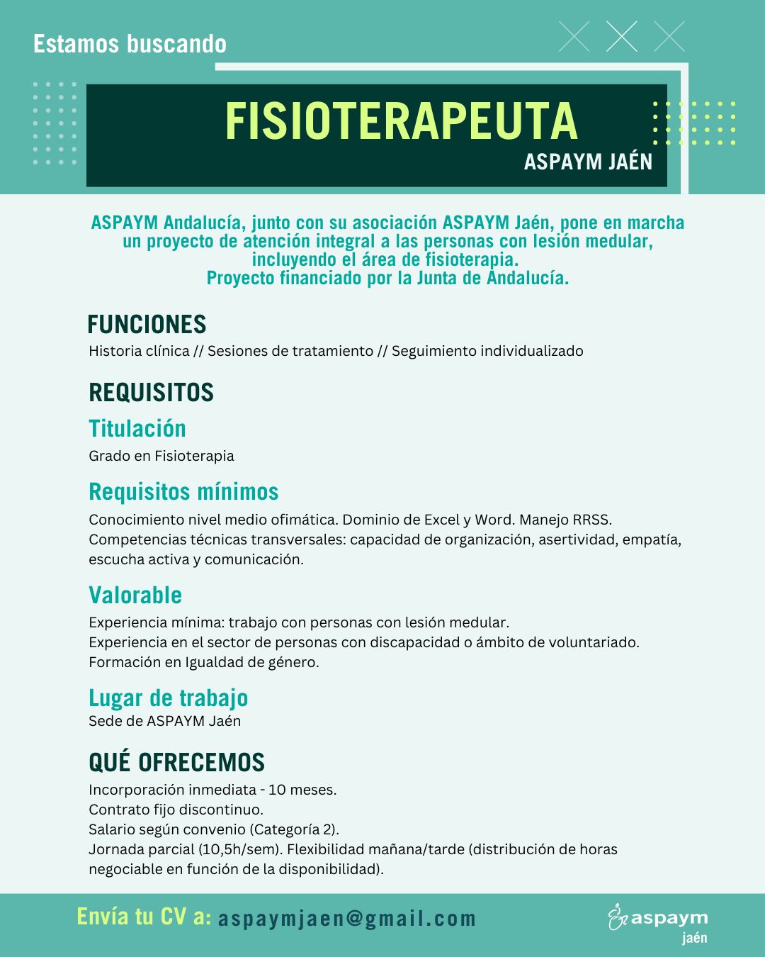 ASPAYM Jaén busca fisioterapeuta. Nuestra entidad federada en Andalucía ha lanzado una nueva oferta de empleo para incorporar a su equipo una persona profesional de la Fisioterapia. Este perfil se incorporará a un nuevo proyecto de atención integral impulsado por la asociación junto a ASPAYM Andalucía, en una iniciativa posible gracias a la Junta de Andalucía.