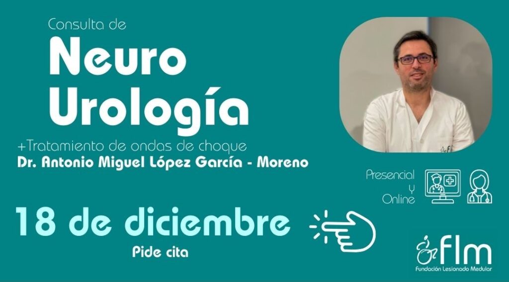 La neurourología vuelve a estar presente entre las citas de la FLM, aunque a mediados del mes que viene. Así, el doctor Antonio Miguel López estará disponible el día 18 de diciembre para enseñar a revisar, regular y gestionar los hábitos de vaciado vesical. De esta manera, cada persona con lesión medular (así como su entorno familiar y afectivo) se encontrará preparada ante cualquier situación incómoda o peligrosa para la salud.