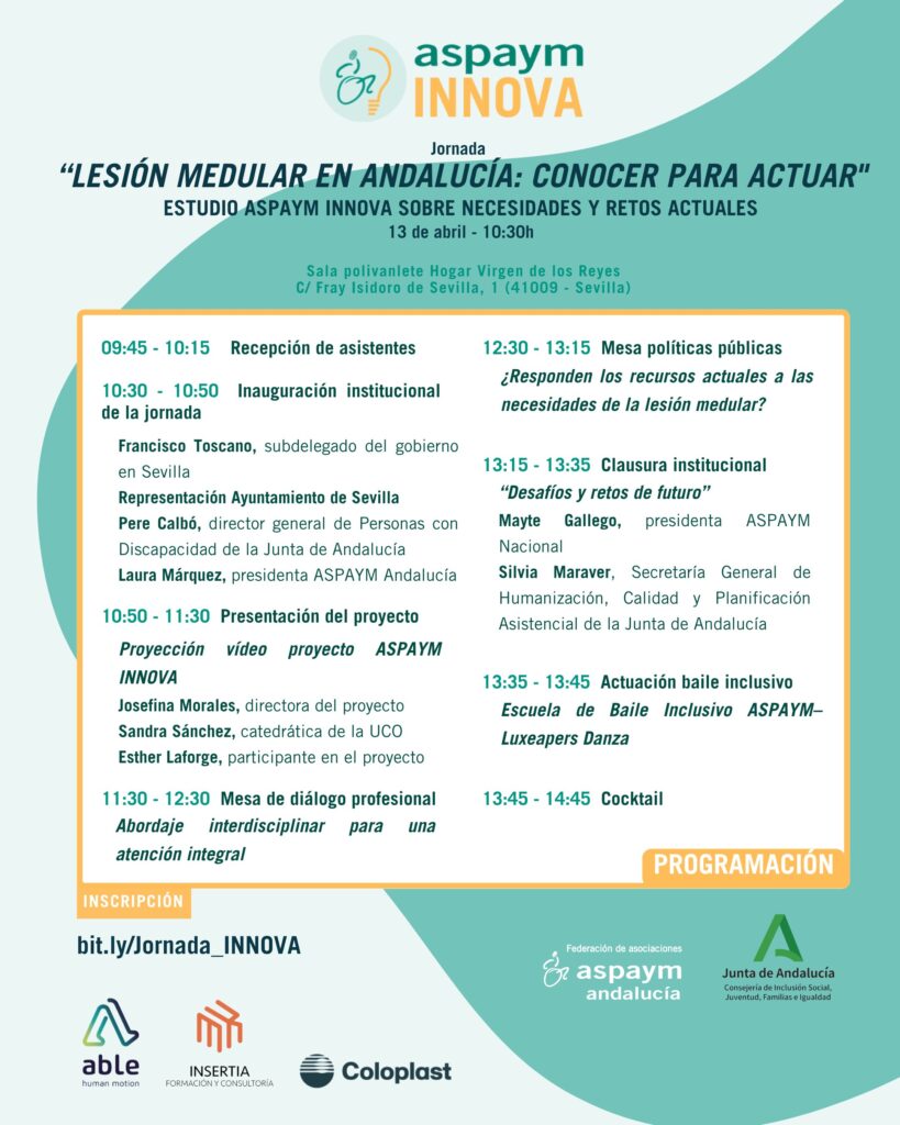 El próximo 13 de abril, ASPAYM Andalucía celebrará en Sevilla la jornada “Lesión medular en Andalucía: conocer para actuar”. En este encuentro clave se darán a conocer los resultados del proyecto ASPAYM INNOVA, la primera investigación aplicada en la comunidad centrada en analizar las necesidades reales de las personas con lesión medular y su entorno.